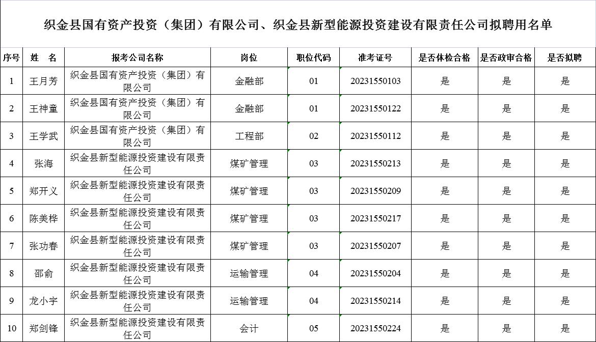 根據(jù)《織金縣國有資產(chǎn)投資(集團)有限公司、織金縣新型能源投資建設(shè)有限責(zé)任公司2023年面向社會公開招聘工作人員公告》,經(jīng)過報名、筆試、面試、資格審查、體檢、政審等程序,現(xiàn)對擬聘用人(名單見附件1)予以公示。fGS貴州163_163貴州人事考試信息網(wǎng)_163貴州事業(yè)單位考試信息網(wǎng)_貴州163網(wǎng)
